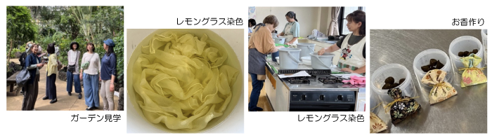 AM ハーブクラフト | 染色(煮染め) | 染めの歴史について、レモングラスの煮染め(媒染法と媒染剤)実習。媒染剤の違いによる発色の違い |